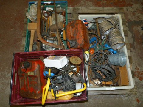 Three Boxes of Tools and Accessories Including Petrol Cans, Site Lamp, Saws, etc.