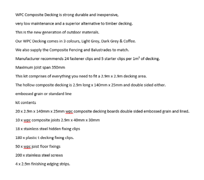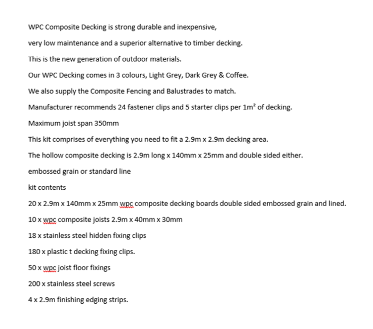 * Complete Dark Grey WPC decking Kit to cover an area of 2.9m x 2.9m includes joists - clips - decking - screws & fixings- finishing strip- everything you need - Installation Instructions Included