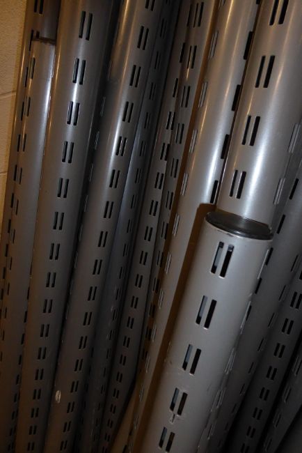 * quantity of clothes display system. Based on 50mm pitched tubular columns. Wooden panels fixtures and rails.