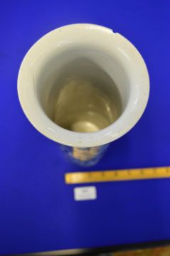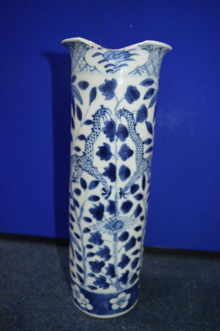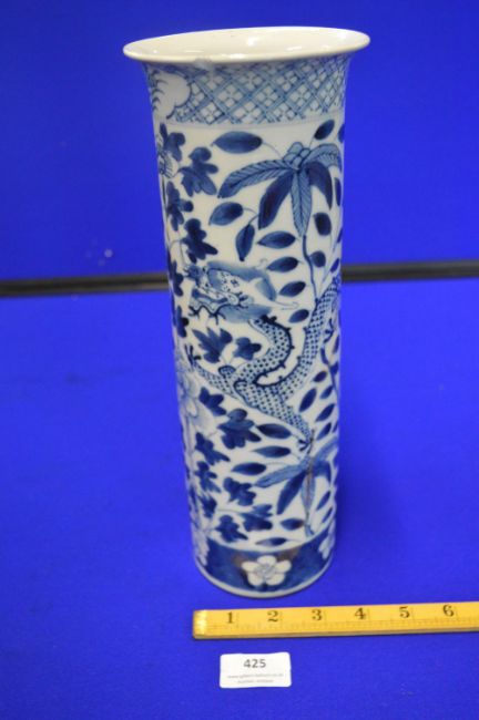 Chinese Blue & White Cylindrical Vase with Dragon Design 12" height (damage to rim from previous repair)