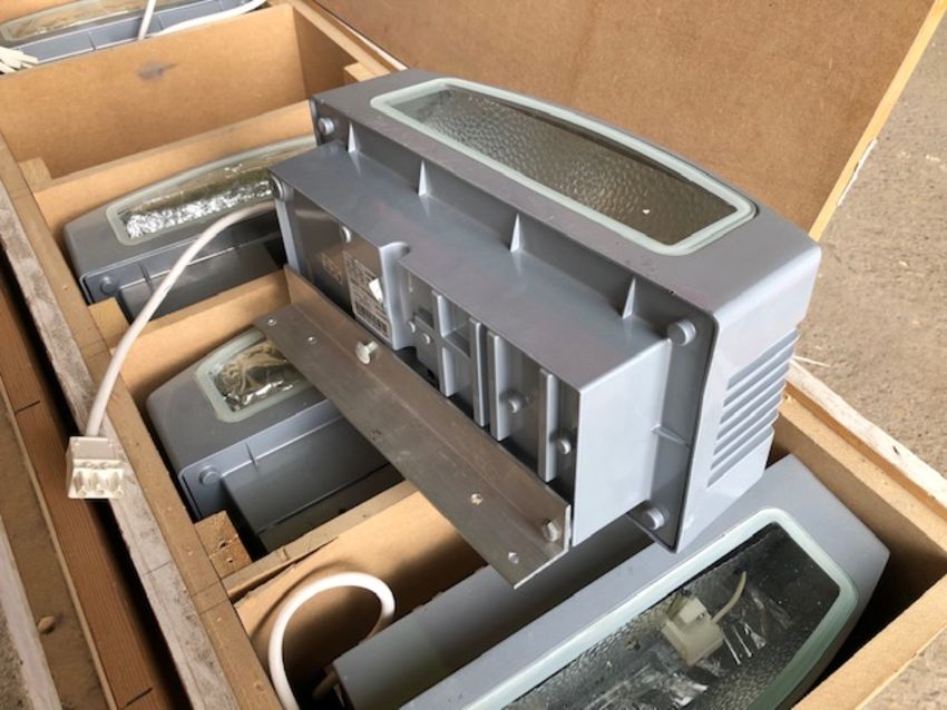 * 10 x 70w hallide up and down wall mounted lights in wooden case