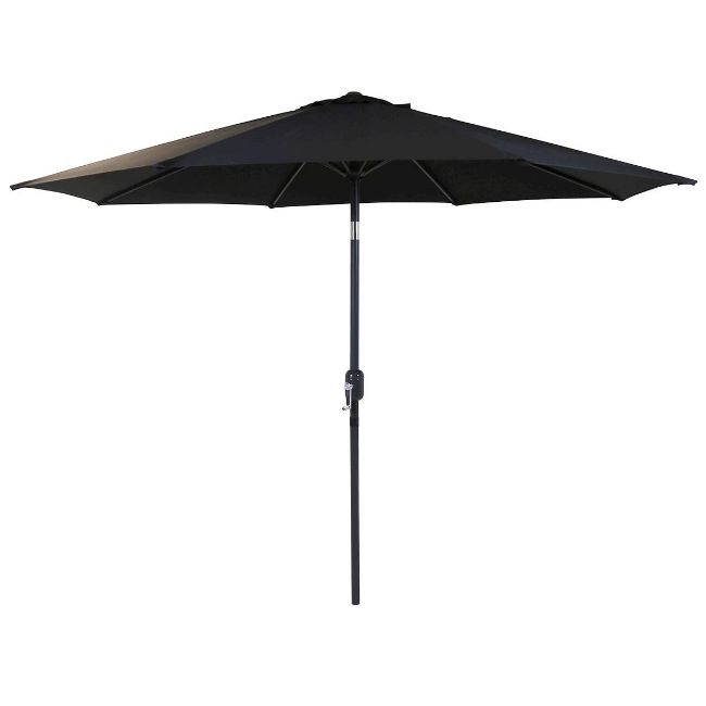 * 1x Black Middle Pole Umbrella with Parasol Base. Parasol 2.7m Diameter. Steel Frame. 180g Polyester. Base, fill with water or sand.