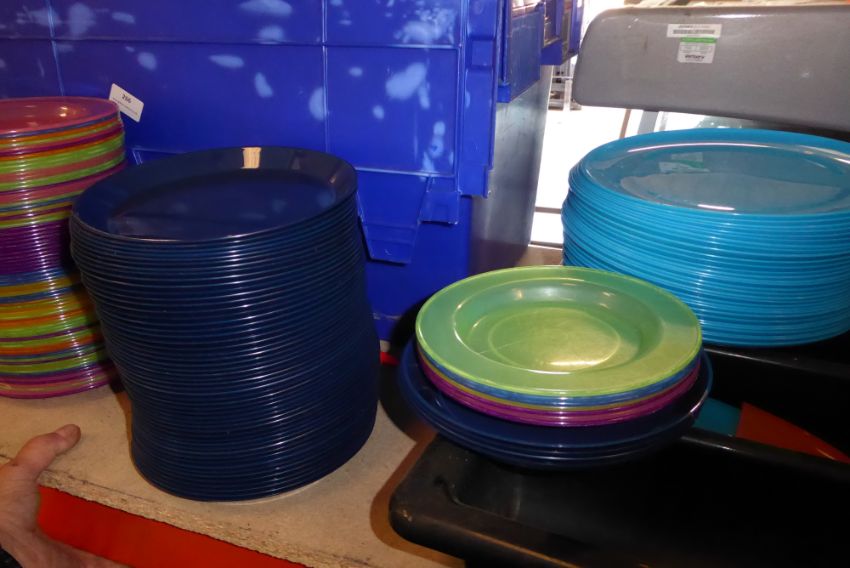 * contents of box - large quantity of plastic children's plates and cutlery