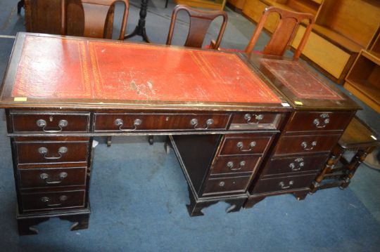 Mahogany Effect Desk and Matching Chest with Tooled Leather Top (requires attention)