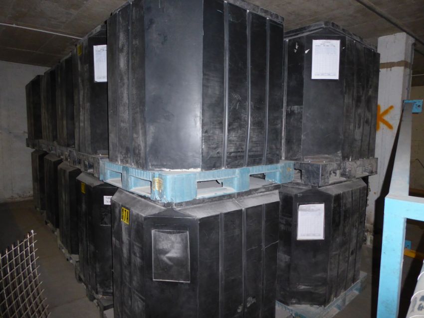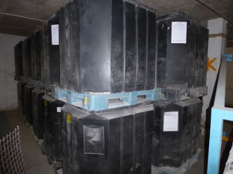 * 10 x Industrial IBC type heavy duty black plastic containers. Have been used to store granulated ingredients. Approx. 750 litre capacity. Includes; pallet with locator straps, container and lid. 1200w x 1000d x 1200h.