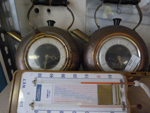Two Novelty Copper Kettle Clocks and a Thermometer