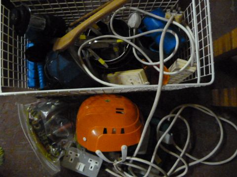 Basket Containing Assorted Camping Cutlery, Gas Kettle, Extension Leads, Pots, Pans, etc.