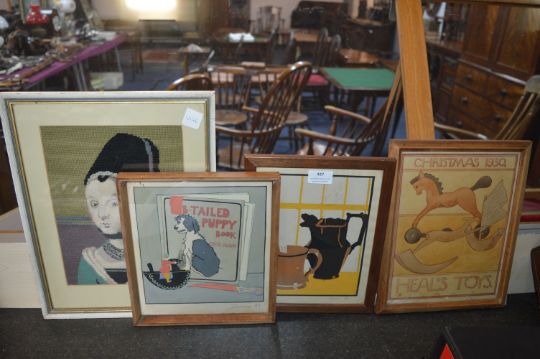 Three Framed Hand Painted Nursery Pictures and a Embroidered Portrait