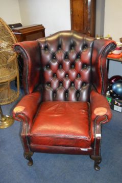 Red Leather Chesterfield Wingback Armchair (slightly distressed)