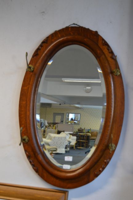Antique Oak Framed Beveled Edge Oval Mirror with Brass Coat Hooks