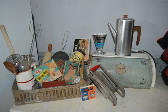 Vintage Kitchenalia, Bread Bin, Utensils, etc.