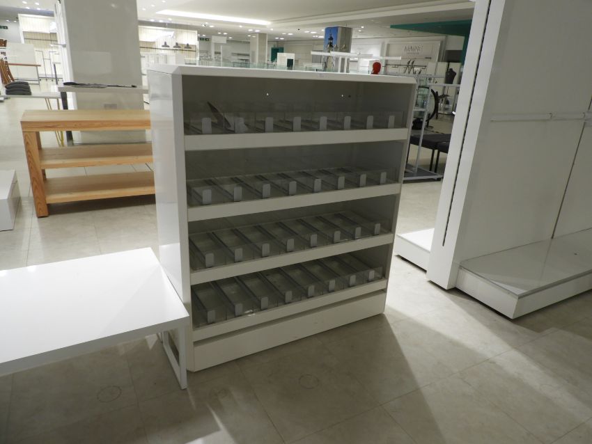 1000 Lots to include: - Multiple NCR Epos Systems, Electronic Stock Control Devices, Store Security System, Point of Sale Counters, Superior Shop Fittings, Garment Rails, Mannequins, Display Tables and Counters, Feature and Designer Lighting, Large Quantity of Quality Stock Room Racking and Shelving, Kick Stools, Aluminium Steps, Mirrors, Etc. Etc. Etc.