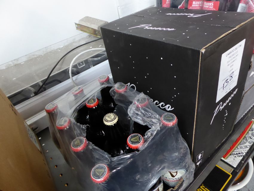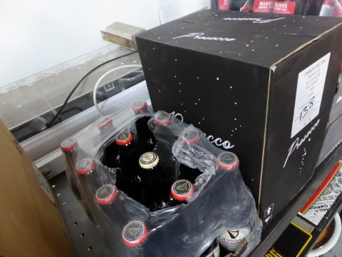 * box of out of date bottles of guinness and box prosecco 6 bottles