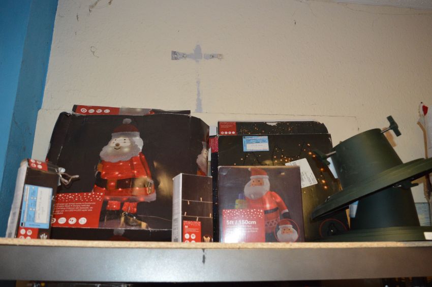 *LED Pop Up Tinsel Santa, Star Lights, Inflatable Santa, Tree Stands (AF - Salvage)