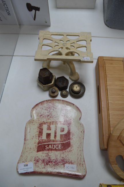HP Sauce Bread Plate, Trivet and Vintage Weights