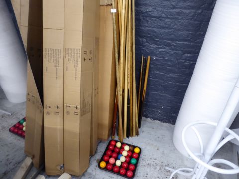* selection on pool cues and rests. approx 10 items plus set of balls