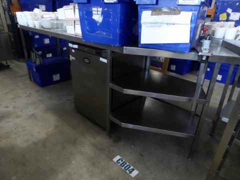 * large stainless steel prep bench, angled corner with three shelves and bonzer tin opener 2800 x 700