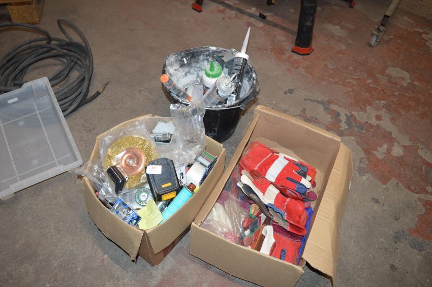 *Two Boxes and a Bucket of Various Building Items; Silicones, Screws, Gloves, Trowels, etc.