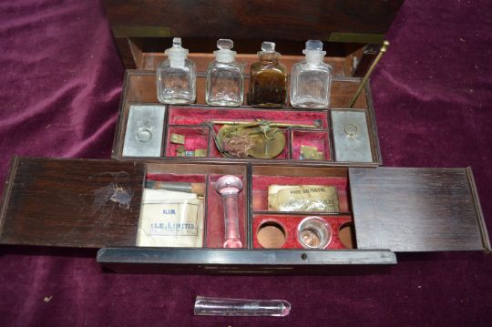 Victorian Mahogany Apothecary Chest with Original Bottles, Scales, etc.