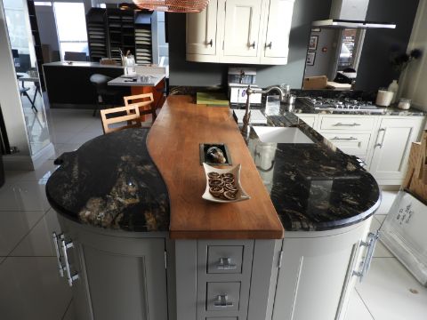 *1909 Display Kitchen with Cosmic Black Granite Worksurfaces, Underslung Sink and Perrin & Rowe Sawn-Neck Tap in Brushed Stainless Steel Finish,