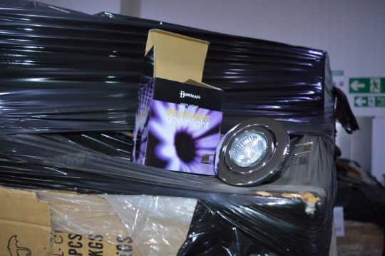 Over 200 Pallets of New and Surplus Electrical Fittings to suite the Domestic and Leisure Industries, lots will include, Mains and Low Voltage Indoor and Outdoor Lighting, Eye Balls, Down Lights, Contemporary Light Fittings, Strip Lights,  Conduits, Sockets and Switches, Twin and Earth, Communication and Other Cabling, Etc….