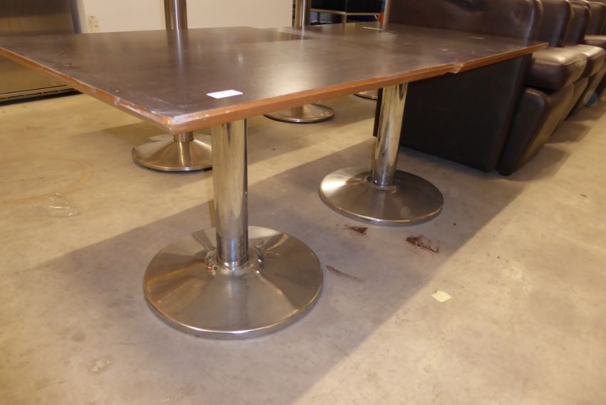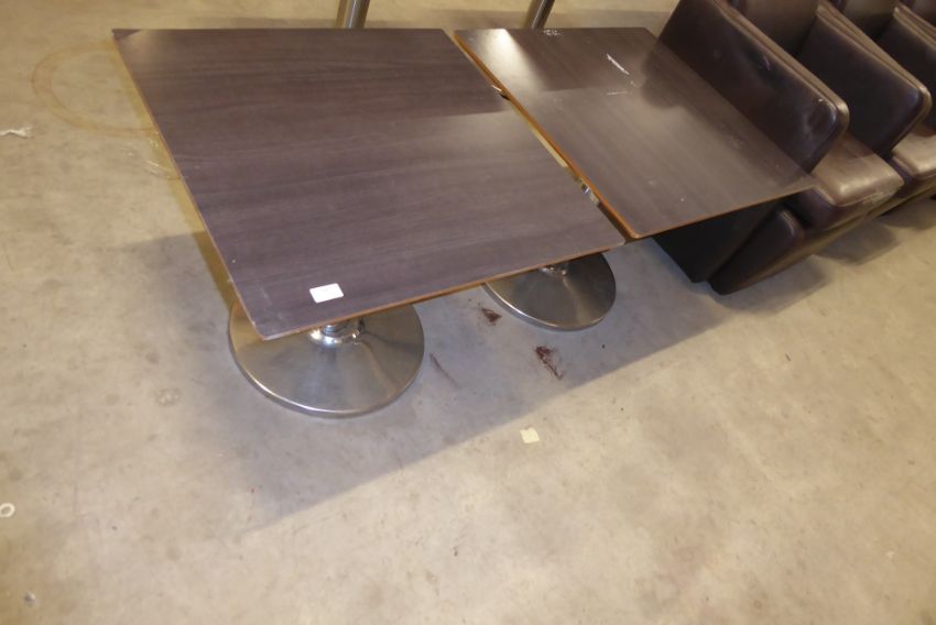 * 2 x low level square topped tables - brushed S/S pedestal bases with dark ash tops