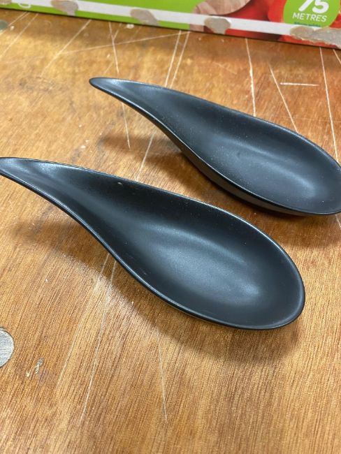 * 131 black ceramic ying/Yang canape spoon in plastic tray