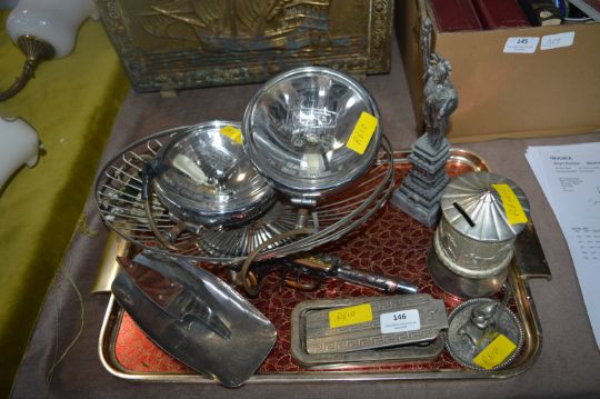 Decorative Metalware etc. Including Two Lucas Car Lamp