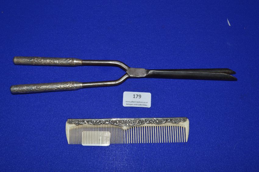 Curling Tongs with Hallmarked Sterling Silver Handles plus Silver Mounted Comb
