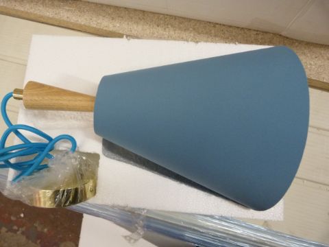 * Bright blue metal ceiling light with gold inner and oakwood suspension. Takes 1 x E27 bulb. 40W. Condition: New Dimensions: H 1300mm x W 223mm