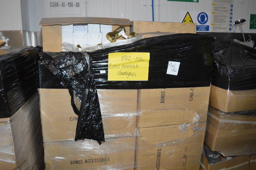 Over 200 Pallets of New and Surplus Electrical Fittings to suit the Domestic and Leisure Industries, lots will include, Mains and Low Voltage Indoor and Outdoor Lighting, Eye Balls, Down Lights, Contemporary Light Fittings, Strip Lights,  Conduits, Sockets and Switches, Etc….