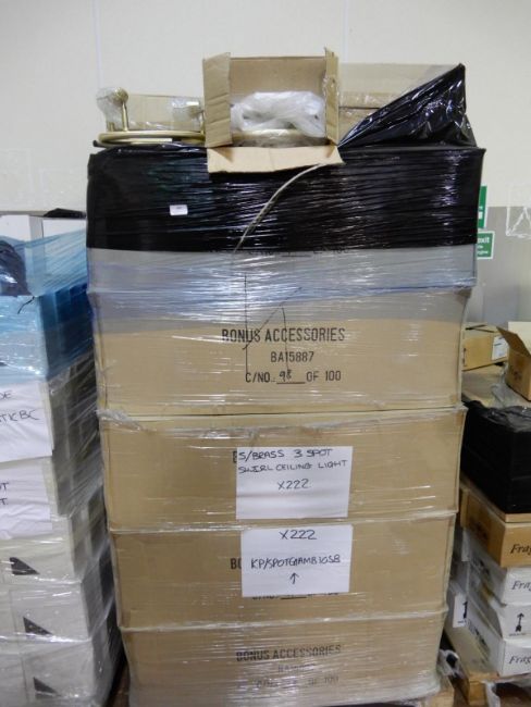 Over 200 Pallets of New and Surplus Electrical Fittings to suit the Domestic and Leisure Industries, lots will include, Mains and Low Voltage Indoor and Outdoor Lighting, Eye Balls, Down Lights, Contemporary Light Fittings, Strip Lights,  Conduits, Sockets and Switches, Etc….
