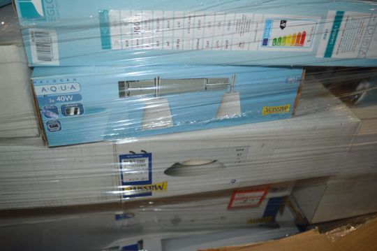 Over 200 Pallets of New and Surplus Electrical Fittings to suit the Domestic and Leisure Industries, lots will include, Mains and Low Voltage Indoor and Outdoor Lighting, Eye Balls, Down Lights, Contemporary Light Fittings, Strip Lights,  Conduits, Sockets and Switches, Etc….