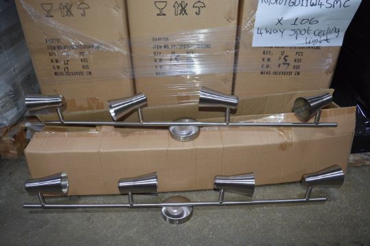 Over 200 Pallets of New and Surplus Electrical Fittings to suit the Domestic and Leisure Industries, lots will include, Mains and Low Voltage Indoor and Outdoor Lighting, Eye Balls, Down Lights, Contemporary Light Fittings, Strip Lights,  Conduits, Sockets and Switches, Etc….