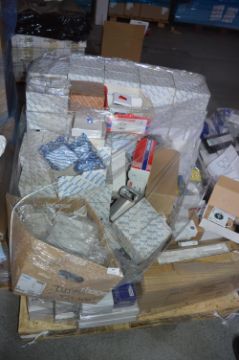 *Pallet of White Plastic Switches, Twin Sockets, Fuses, Sensors, and Boxes of Trunking Clips