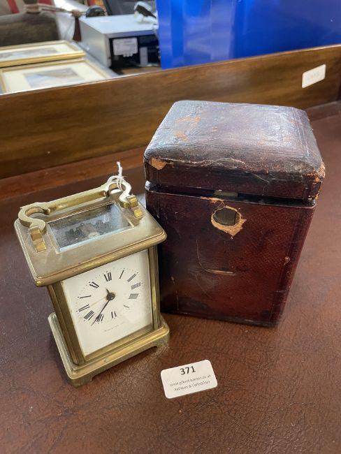 Continental Period Brass Carriage Clock with Enameled Face and Original Leather Case (some faults)