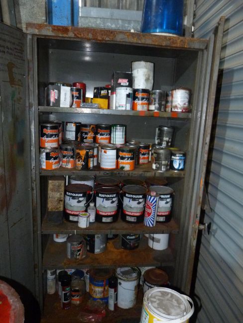 *Contents of Steel Cabinet; Emulsions, Paints, etc. (~40 tins)