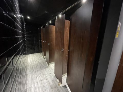 *Four Simulated Rosewood and Stainless Steel Shower Cubicles