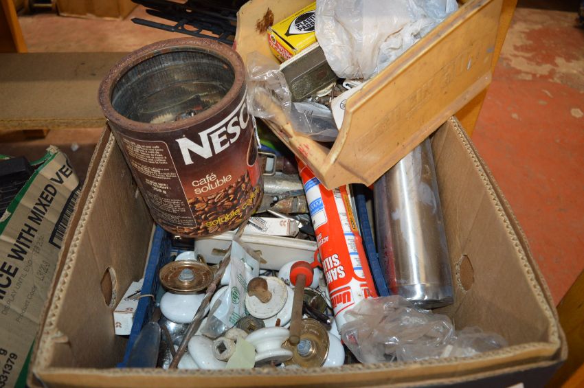 Box of Various Handles, Adhesives, Wood Chisels, etc.