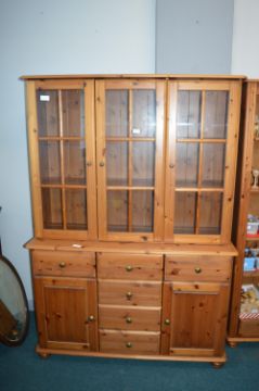 Solid Pine Glazed Two Part Cabinet with Six Drawers, Two Cupboards, and Three Shelves