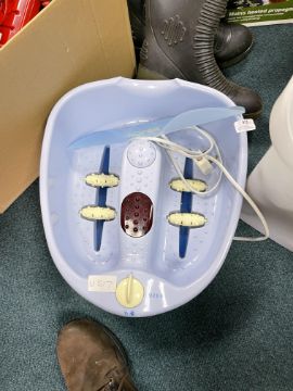 Two Boxes of Assorted Household Goods Including Wellington Boots, Foot Spa, Clocks, etc.