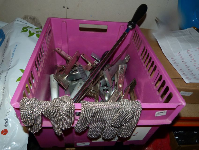 *Storage Tub of Chainmail Safety Gloves, Metal Clamps, etc.