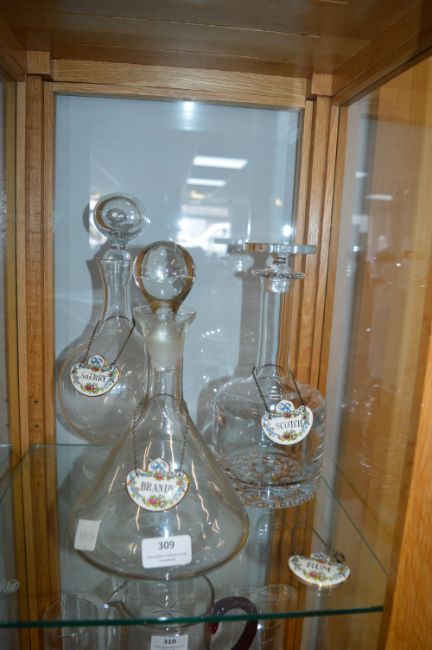 Three Glass Decanters with Spirits Labels