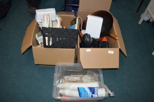 Two Large Boxes of Kitchenware; Woks, Toaster, Cook Books, Disposable Cups, etc.
