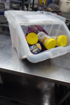 * Plastic tub and contents - inc hot drink supplies and biscuits