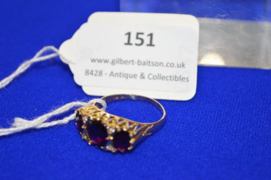 9k Gold Ring with Three Garnets ~4.1g gross, Size: U+ (worn markings)