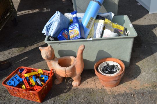 Storage Tub Containing Plant Pots & Garden Items & Plastic Meccano