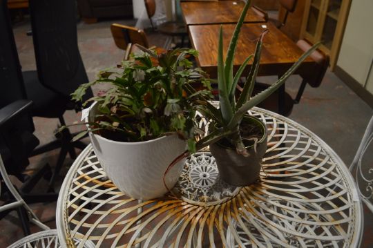 *Folding Steel Bistro Table and Two Chairs with Two Potted Plants