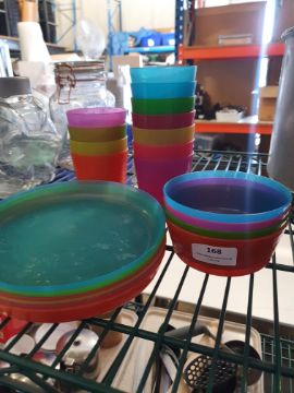 * plastic cups, plates, bowls