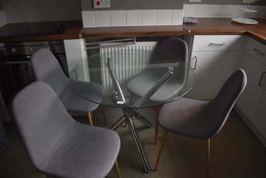 *Glass Topped Circular Table on Chrome Pedestal with Four Contemporary Chair
